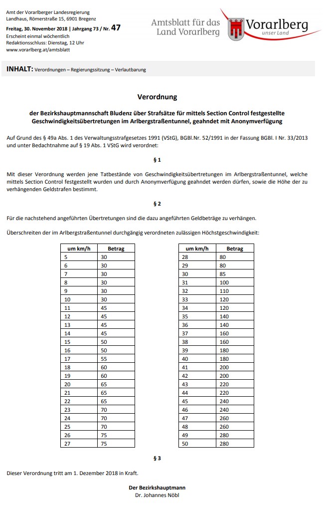 Im Amtsblatt des Landes Vorarlberg vom 30.11.2018 wird ein Strafenkatalog, der schon ab dem 01.12.2018 gelten soll, kundgemacht.